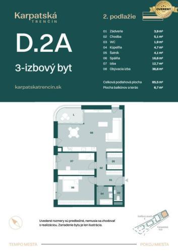 IBA U NÁS! RADO Reality ponúka na predaj 3-izbový byt s označením D.2A v bytovom dome D, s veľkorysou interiérovou plochou 85,50 m² a loggiou o rozlohe 6,8 m² – výnimočné kombinované riešenie, ktoré poskytuje viacero možností na trávenie voľného času. Byt sa nachádza na 2. podlaží v exkluzívnom projekte Rezidencia Karpatská, ktorý vyrastá v jednej z najlukratívnejších častí Trenčína. Dispozícia bytu je praktická a vzdušná – 3+kk, ideálna pre pár, jednotlivca alebo aj ako investícia.