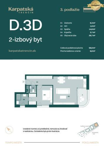 IBA U NÁS! RADO Reality ponúka na predaj 2-izbový byt s označením D.3D v bytovom dome D, s veľkorysou interiérovou plochou 60,00 m² a loggiou o rozlohe 6,76 m² – výnimočné kombinované riešenie, ktoré poskytuje viacero možností na trávenie voľného času. Byt sa nachádza na 3. podlaží v exkluzívnom projekte Rezidencia Karpatská, ktorý vyrastá v jednej z najlukratívnejších častí Trenčína. Dispozícia bytu je praktická a vzdušná – 2+kk, ideálna pre pár, jednotlivca alebo ako investícia.