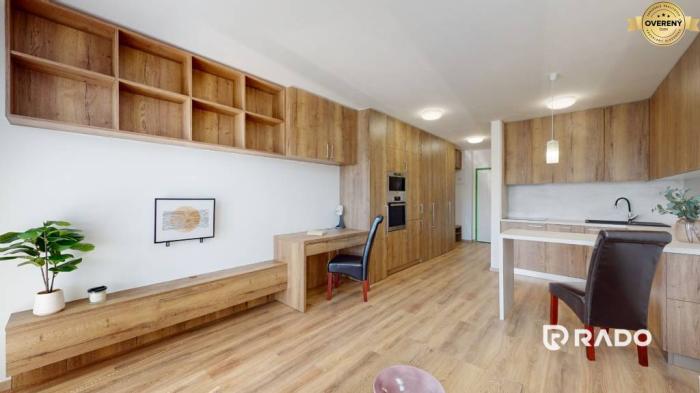 Byt je zariadený štýlovým nábytkom z masívu vyrobeným na mieru, ponúka dostatok úložného priestoru a plnohodnotnú kuchyňu so všetkými spotrebičmi. Je priestranný, vzdušný, výhodou je aj balkón, kde sa dá príjemne posedieť.