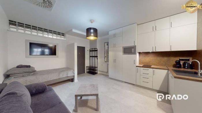 V prvej časti je vstupná chodba, kuchyňa s obývacím, jedálenským a odpočinkovým priestorom. Kuchynská linka je na mieru robená a je plne vybavená vstavanými spotrebičmi (umývačka riadu, chladnička s mrazničkou, indukčná varná doska a mikrovlnka). V kúpeľni s toaletou a sprchovým kútom sa nachádza aj práčka. Druhá čast byt je oddelená sklenenými dverami a nachádza sa tu spacia časť s manželskou posteľou. Okrem toho tu nájdete 2x smart TV Samsung a vonkajšie žalúzie s diaľkovým ovládaním.Všetko je úplne nové a nádherne zariadené.