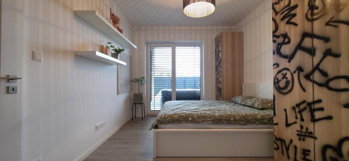 Zariadený 2-izbový byt s obytnou plochou 47,32 m2 má spálňu s výmerou 14,31 m2, obývaciu izbu 13,60 m2, kuchyňu 4,36 m2, predsieň 4,94 m2, pivnicu 5,03 m2 a terasu 7,46 m2. Nachádza sa na prízemí bytového domu s orientáciou smerom do centra mesta na juhovýchod. Byt má veľké presklené plochy, z oboch izieb sa vychádza na terasu. V cene bytu je aj vyhradené parkovanie pred bytovým domom.