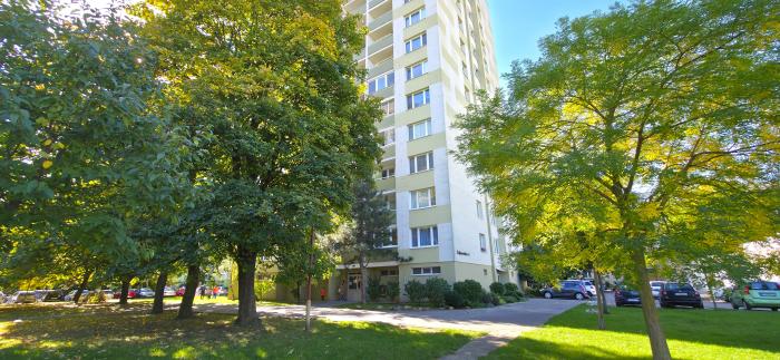 Panelový bytový dom s bezbariérovým vstupom a novým nákladným a osobným výťahom prešiel kompletnou rekonštrukciou a zateplením fasády. Spoločné priestory sú udržiavané, prostredie domu pôsobí upravene, a bezpečne pod dohľadom kamerového systém.
