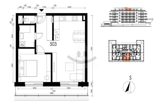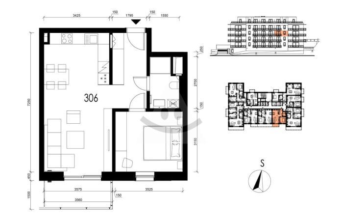 vstupná chodba, obývacia izba s kuchyňou + balkón alebo terasa, izba, kúpeľňa, WC, pivničná kobka.