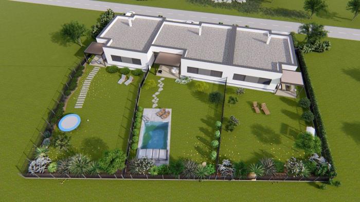 Domy budú napojené na prípojky elektriny, vody a kanalizácie, steny sú murované z tvárnic Heluz, zateplené tepelnou izoláciou, strop nad 1. NP bude tvorený stropným systémom Premaco, strecha plochá so sklonom, vykurovanie objektu je riešené elektrickým podlahovým kúrením (možnosť realizácie tep. čerpadla za príplatok. predpríprava na klimatizáciu, krb, vonkajšie žalúzie, K domom bude vybudovaná nová komunikácia.