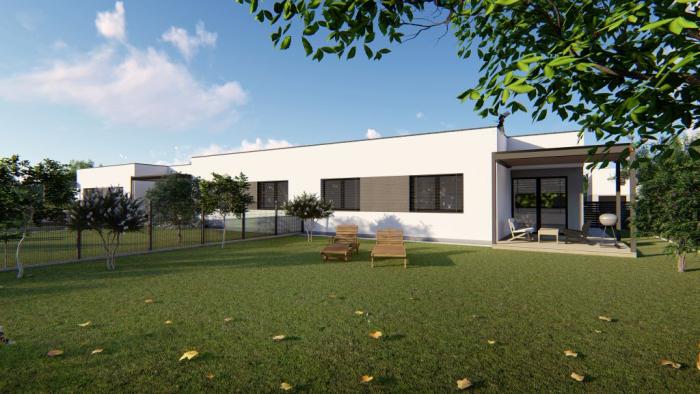 Dispozícia domu: hlavný vstup je navrhnutý z východnej strany (od komunikácie. Vstupuje sa cez predsieň do chodby, z kadiaľ sú prístupné všetky obytné miestnosti rodinného domu. Z predsiene je prístup aj do WC a technickej miestnosti. Z chodby je prístupná denná časť, obývacia miestnosť s kuchyňou na jednej strane a na druhej strane je spálňa, druhé WC, kúpeľňa a na konci chodby dve izby. Z obývacej miestnosti je prístup na terasu. K dispozícii je garáž, ktorá je priechodná z prednej časti do záhrady.