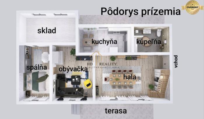 - menšia kuchyňa s prechodom do izby s krbom (s prieduchmi na poschodie) a výstupom na terasu