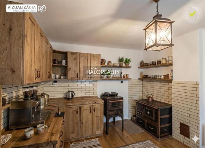 Kuchyňa: vkusná kuchyňa s drevenou kuchynskou linkou, funkčným sporákom a podlahou s drevenou dlažbou, ktorá dodáva interiéru teplo domova.