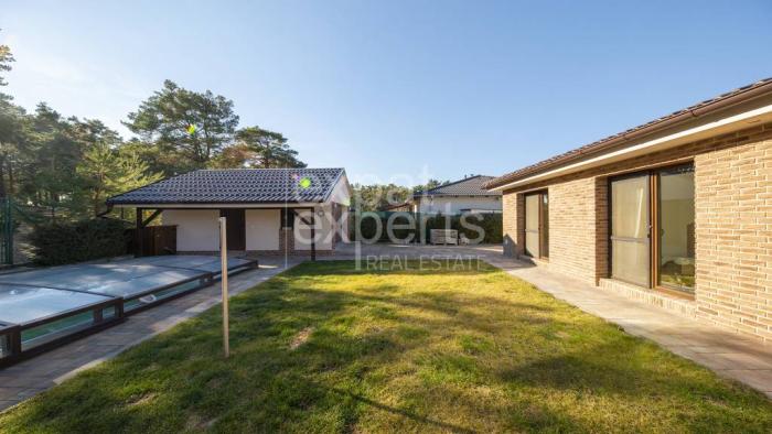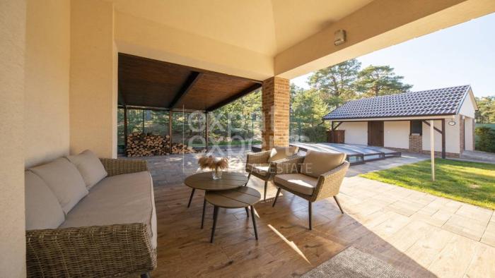 V záhrade sú dve terasy o výmere 9,69 m2 a 30 m2 , garáž na jedno auto a samostatná kotolňa 7,62 m2 s kotlom na drevo a úložným priestorom. Ku garáži vedie príjazdová cesta, na ktorej sa dá tiež parkovať. Na konci príjazdovej cesty je veľká posuvná brána, pred ktorou je drevený prístrešok pre ďalšie dve autá. Za bazénom, do ktorého vstupujeme z väčšej terasy, je bránka vedúca priamo do lesa. Všetky trávnaté časti záhrady sú udržiavané automatickým zavlažovacím systémom. Bazén je udržiavaný robotickým samočistiacim vysávačom a filtráciou.
