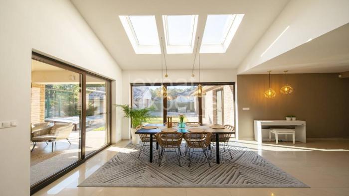 V dome je hlavný vstup s priestrannou halou 10,74 m2, v ktorej je vstavaný úložný priestor, so vstupom do veľkej pracovne/hosťovskej izby 25,17 m2, ďalším vstupom do práčovne12,8 m2 a ďalej do veľkorysej kuchyne spojenej s obývacím priestorom 60 m2 s otvoreným stropom a krásnou jedálenskou časťou s veľkými terasovými oknami a dverami a výhľadom do udržiavanej záhrady s prekrytým bazénom, za ktorým sa hneď za bránkou črtá les.