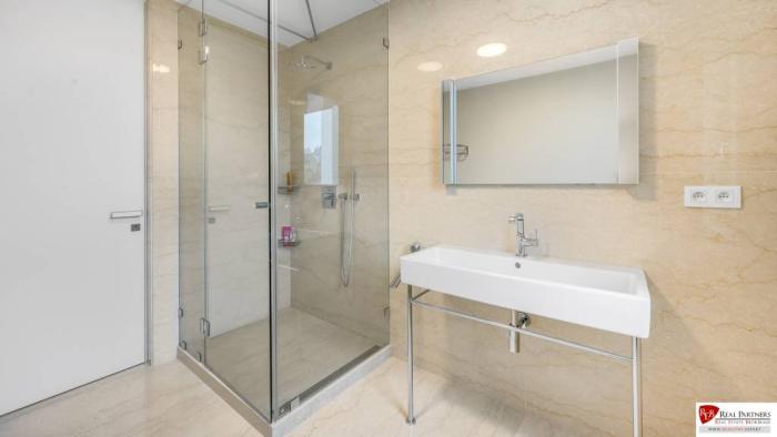 Vedľa je kúpelňa so sprchovacím kútom, 2 umývadlom, WC a fínska sauna a terasa 25 m2.