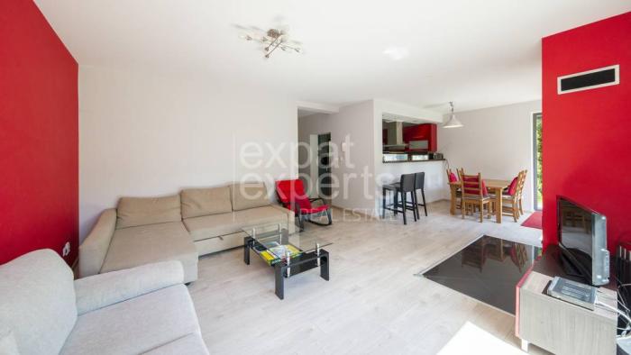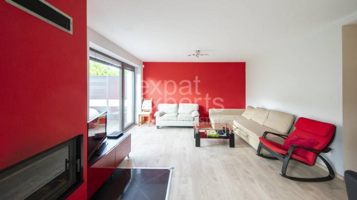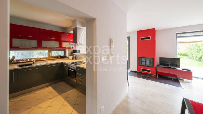 Dom je súčasťou dvojdomu avšak so zachovaním súkromia, na prízemí sa nachádza vstupná hala priestranná hala, obývacia izba s krbom, jedálenskou časťou a vstupom na terasu a do záhrady s exteriérovým krbom a záhradným domčekom na uskladnenie vecí, priestranná kuchyňa, kúpeľňa so sprchovacím kútom s toaletou, sklad a komora.