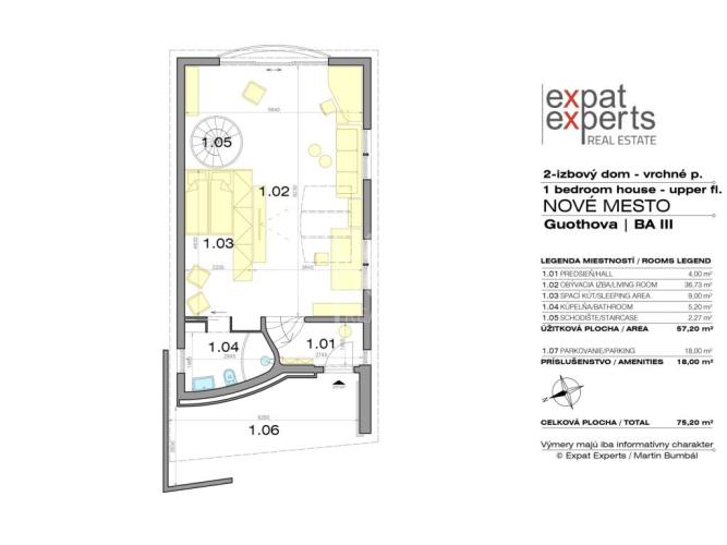 Vstupné horné podlažie: Vstupná hala, kúpeľňa so sprchovacím kútom a WC, obývacia časť s pracovnou galériou a oddeleným spacím kútom.
