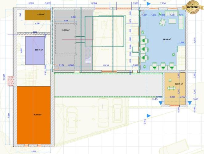 Rezidencia je rozdelená na dve časti každá zo samostatným vstupom. Jedna časť bola koncipovaná ako obytná a druhá časť domu ako kancelársky priestor, ale po menších úpravách je možné ju zmeniť tiež na obytnú časť. Dom je stavaný v modernom industriálnom štýle, ako veľký loftový priestor, má 14 rokov. Súčasťou domu je veľká štvor- garáž. Pred domom je možnosť parkovania ďalších päť vozidiel.