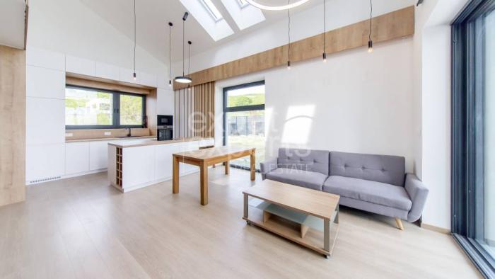 Stavba je dokončená, realizácia interiéru dokončená, dom je zariadený na mieru vyrábaným nábytkom. Dom je momentálne prenajatý, takže je vhodný aj ako investičná nehnuteľnosť.