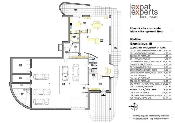 Celkový počet miestností: 15 (vrátane bazénu, garáže, skladov, vínnej pivnice, zimnej záhrady)