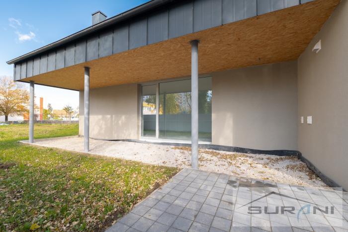 Prízemie: zádverie, technická miestnosť, chodba, kúpeľňa, samostatná izba, obývacia izba spojená s kuchyňou a vstupom na terasu.