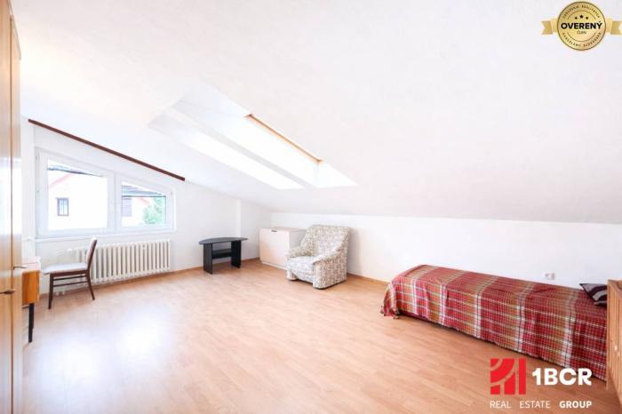 Prízemie je mierne vyvýšené a po vstupe do domu sa nachádza vstupná chodba, kde po pravej strane je toaleta a komora, po ľavej strane menšia izba, ktorú majitelia využívali ako šatník. Ďalej sa dostaneme do svetlej kúpeľne v neutrálnych bielych tónoch vybavenej rohovou vaňou a bidetom. Rovno od vchodu sa nachádza priestranná izba, ktorú možno využiť ako pracovňu, hosťovskú izbu či herňu. Dominantou prízemia je priestranná obývacia izba prepojená s kuchyňou. Vzdušný a svetlý interiér s krbom navodí príjemnú atmosféru počas chladných večerov a v letných mesiacoch oceníte klimatizáciu. Z tohto priestoru je aj výstup na zastrešenú terasu a do záhrady, ktorá ponúka priestor na relax alebo rodinné posedenia. Na poschodí sa nachádzajú štyri samostatné, priestranné izby, z ktorých jedna má vlastný balkón. Na tomto podlaží sa nachádza tiež kúpeľňa v neutrálnej bielej farbe so sprchovým kútom a WC.