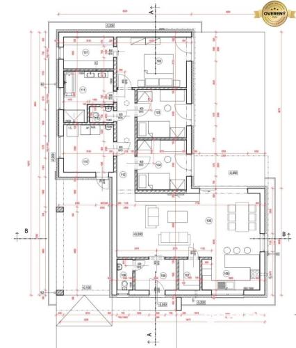 • Priestranná obývacia izba (35,06 m²) prepojená s kuchyňou (7,64 m²) a komorou (2,58 m²)