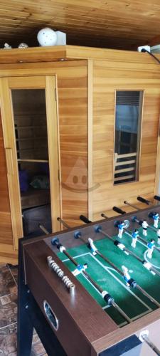 A teraz to najlepšie – tento dom je doslova súkromným wellness centrom! Čaká na vás zasklená terasa so saunou pre štyroch, kde si po náročnom dni dokonale oddýchnete. Po saune sa môžete osviežiť v 1,5 m hlbokom, štvormmetrovom kruhovom zateplenom bazéne s protiprúdom – áno, tu sa dá skutočne plávať! A keď chcete relaxovať v spoločnosti priateľov či rodiny, pozývame vás do osemmiestnej vírivky na drevo, kde si vychutnáte bublinky pod hviezdami.