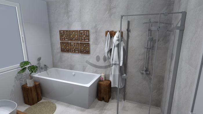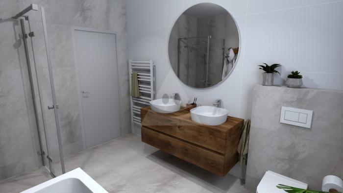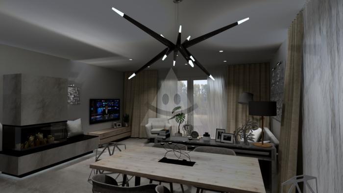 Dispozičné riešenie domu: vstupná chodba s miestom na vstavanú skriňu, hosťovské WC, technická miestnosť, hlavná kúpeľňa s prípravou na dve umývadlá, sprchový kút, vaňu a WC. Obývacia izba je spojená s kuchyňou a východom na zastrešenú terasu, špajza, dve detské izby, rodičovská spálňa. Piata izba je navrhnutá ako pracovňa alebo hosťovská izba so samostatnou kúpeľňou a WC a prípadne samostatným vstupom z vonku.