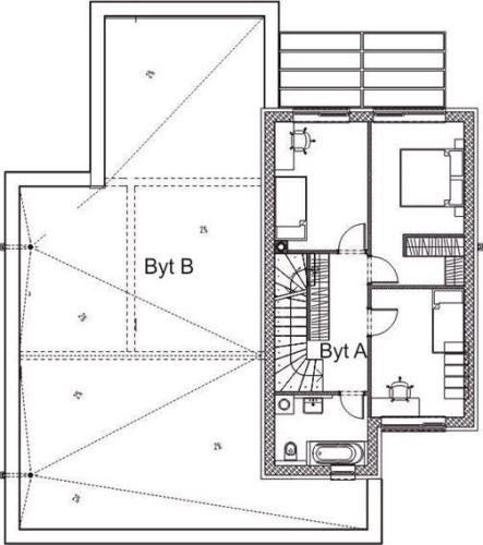 Tento dvojdom pozostáva z dvoch samostatných rodinných domov - rodinného domu A a rodinného domu B, ktoré sú spojené spoločnou stenou. Táto konštrukcia zabezpečuje zníženie tepelných strát a maximalizuje ekonomické využitie. Zároveň maximalizuje využitie pozemku. Oba rodinné domy sú navrhnuté s dôrazom na čo najnižšiu energetickú náročnosť a optimálne priestorové využitie.