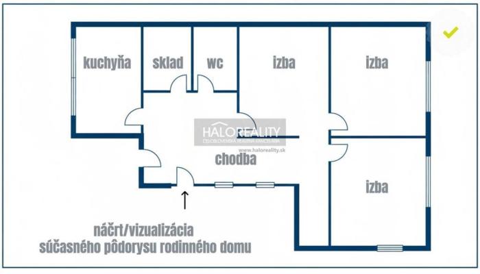 Dom pozostáva z troch izieb, kuchyne, kúpeľne s WC, chodby a povaly, ktorá môže slúžiť ako úložný priestor alebo ponúka možnosť rozšírenia obytného priestoru.