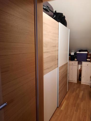 3- izby samostatné, jedna izba s balkonom, šatník, kúpelňa s WC /geberit/. V kúpelni priame vetranie /2 strešné okná/. Z chodby sú skladacie schody na povalu, kde je odkladací priestor.