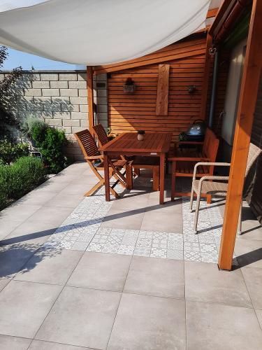 Vstup bezbarierový, vstupná chodba, garáž, spálňa /hosťovská izba/, kúpelňa s WC /geberit/, práčovňa /práčka, sušička/. Odkladací priestor pod schodami, schody na poschodie. Vstup do obývačky s kuchyňou, výstup na terasu 3x9 m2, ktorá ma z časti pergolu a výsuvnú markýzu. S terasou je spojená pekná, upravená záhradka na relax.