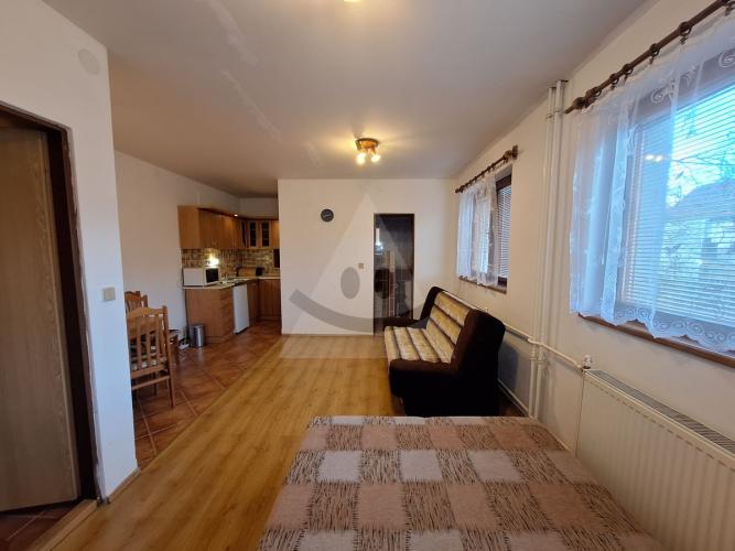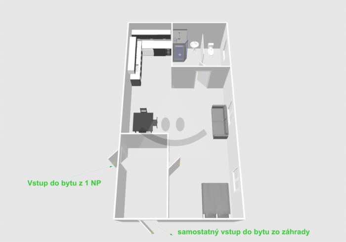 Obytná časť: Samostatný 1-izbový byt (chodba, kúpeľňa s WC, kuchynský kút spojený s izbou).