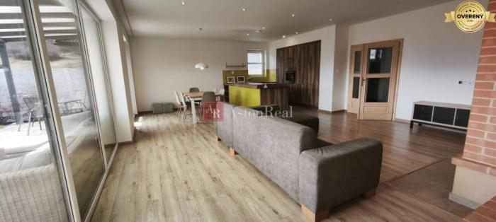 priestranná obývacia izba prepojená s kuchyňou a jedálňou s priamym vstupom na terasu