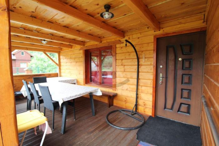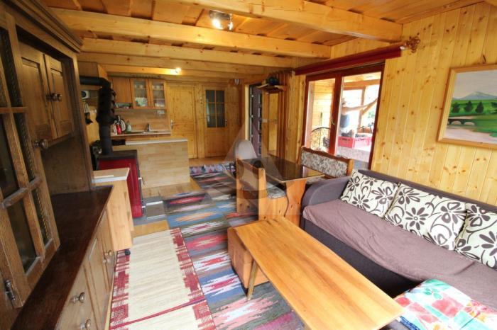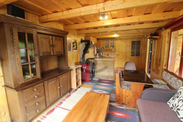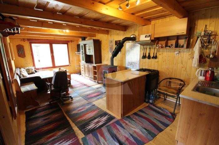Dispozične: pred vstupom je veľká terasa na posedenie, bezpečnostné dvere. V chatke dominuje veľká obývacia izba spojená s malou kuchynkou, spálňa, WC, špajza a odkladací priestor.