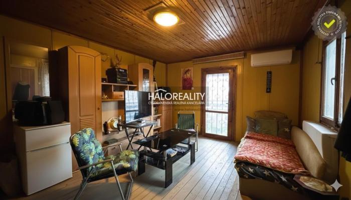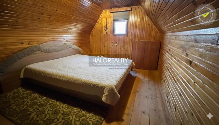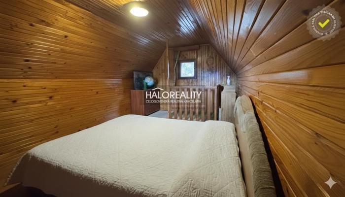 2. podlažie: Prístupné dreveným schodiskom, vyhradené ako nočná časť s priestorom na spanie pre 3 až 4 osoby (podľa predstáv nového majiteľa). Exteriér: Zastrešená terasa s posedením pred vstupom do objektu. Zadná časť za chatkou je využitá na toaletu a samostatnú dreváreň.