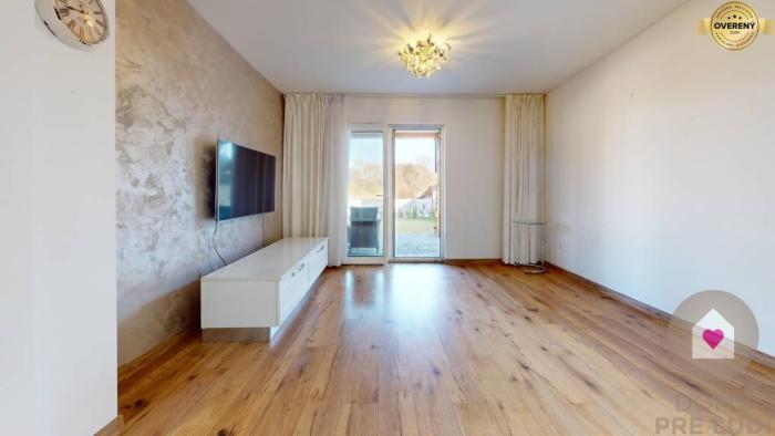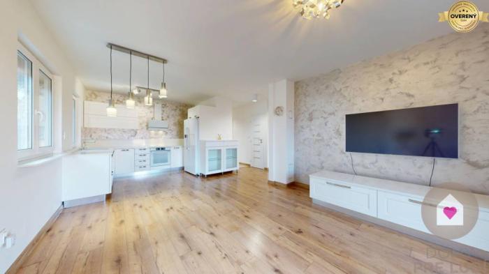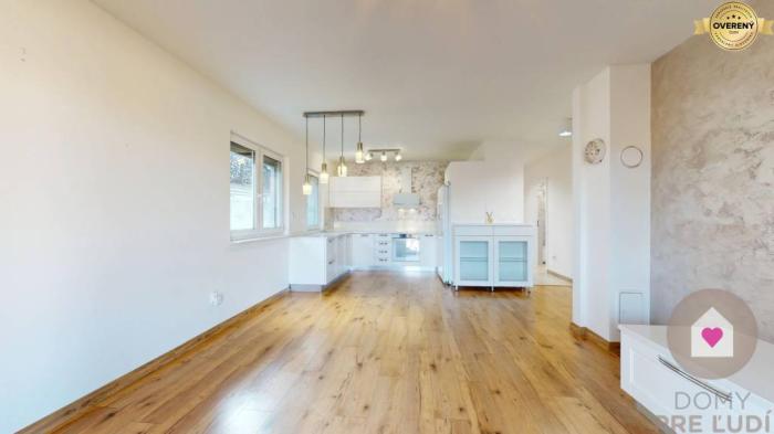 - priestrannej obývacej miestnosti spojenej s kompletne vybavenou kuchynkou časťou o výmere 26,09 m2 ( kuchynská linka na mieru so vstavanými spotrebičmi (umývačka riadu, el. rúra, varná doska, digestor) a samostatne stojaca americká chladnička s mrazničkou. Z obývacej miestnosti a zo spálne sa vychádza na slnečnú prekrytú terasu o výmere 13,75 m2. Taktiež sa tu nachádza predpríprava na krb.