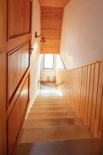 2. nadzemné podlažie – chodba, 2 samostatné izby, kúpeľňa s WC, kuchyňa s plynulým prechodom do obývacej izby s krbom a prechodom na balkón.