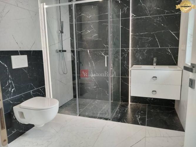 Zrekonštruovaná kúpeľna so sprchovym kútom, umývadlom a WC,
