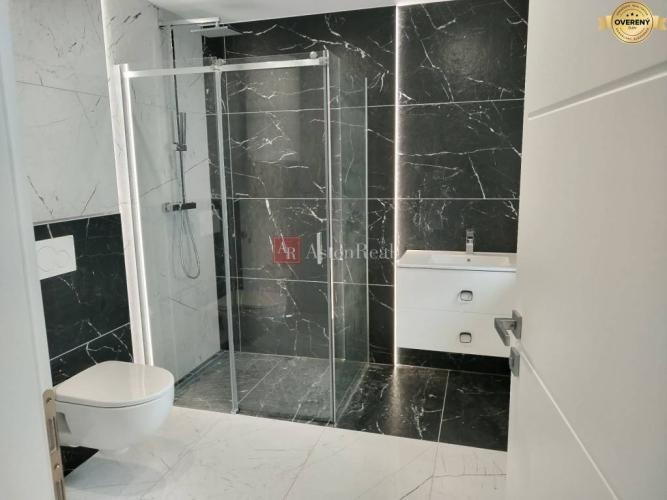 Zrekonštruovaná kúpeľna s veľkým sprchovym kútom, umývadlom a WC a prípojou na práčku a sušičku,