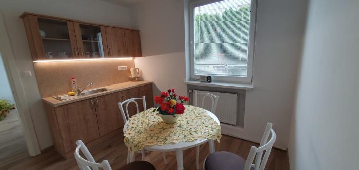 - kuchyňa: kuchynská linka (sporák bude dodaný), stôl so stoličkami,