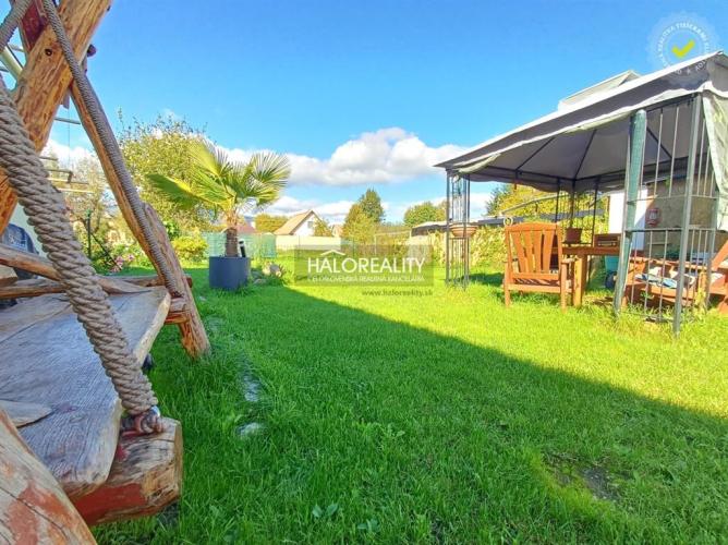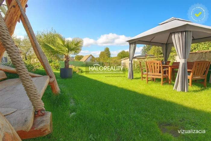 V zadnej časti pozemku je posedenie, drevená hojdačka, altánok...