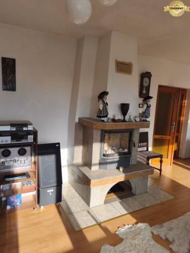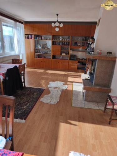 2. podlažie veľká obývačka s teplovzdušným krbom, kuchyňa, chodba, špajza a kúpeľňa s vaňou a WC