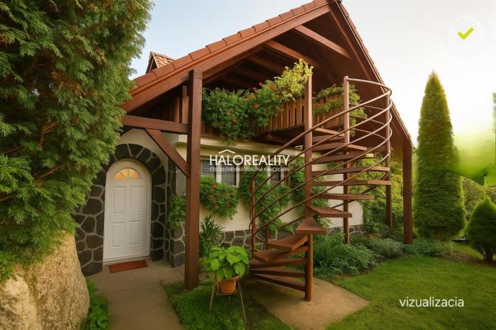 - terasa vhodná na posedenie, prístupná z dvora točitým schodiskom s výhľadom do prírody