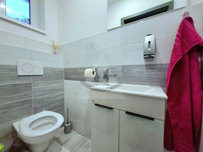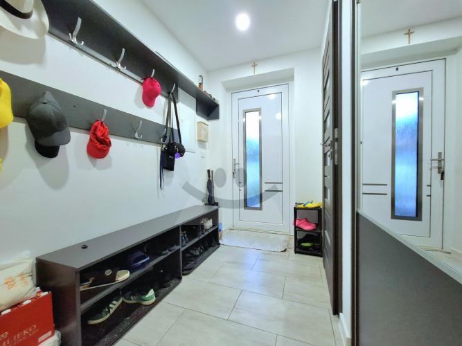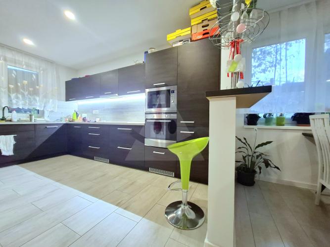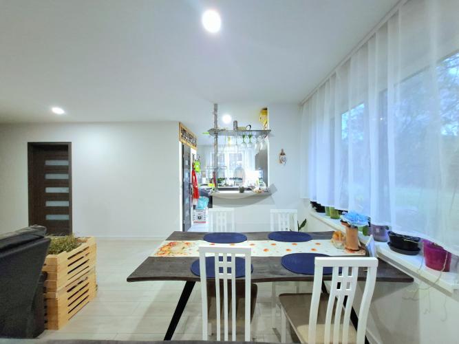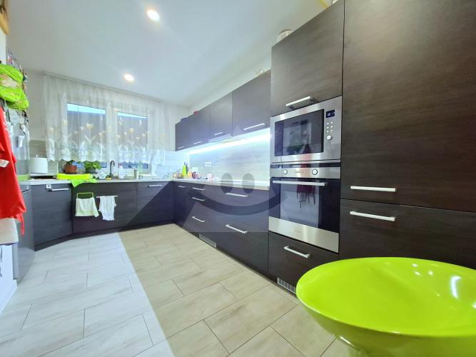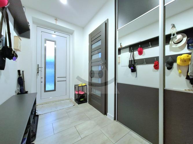 Interiér domu pozostáva za vstupnej chodby, 1 samostatného WC, následnej veľkej obývacej izby, spojenej s kuchyňou, ktorá disponuje vstavanými spotrebičmi a LED podsvietením kuchynskej linky.Po ruke je špajza vhodná na uskladnenie všetkých chutných zaváranín, priamo z vašej novej záhrady. Samotná obývacia izba pozostáva z jedálenskej a obývacej časti, kde nájdeme krásny mohutný krb, ktorý dodáva celému domu pocit pohodlia. Nočná časť domu sa skladá zo spálne a 2 detských izieb. Samozrejme, súčasťou domu sú aj 2 technické miestnosti, 1 slúži na pranie a jej zhodou je, že dvere z nej vedú priamo k vonkajšiemu priestoru na sušenie bielizne a oblečenia. 2 technická miestnosť je na už spomínané nakladanie krbu.