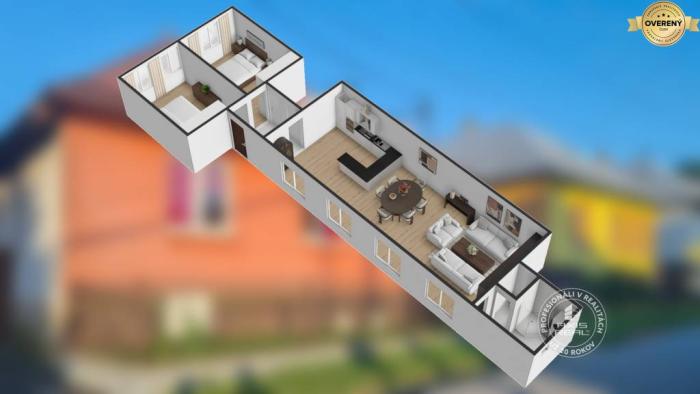 Dom je vhodný na kompletnú rekonštrukciu, čo budúcemu majiteľovi dáva jedinečnú príležitosť vytvoriť si domov presne podľa svojho vkusu a potrieb. Menšia izba s výmerou 36 m² ponúka možnosť zriadiť spálňu a detskú izbu, zatiaľ čo veľká izba o výmere 56 m² poskytuje priestor pre moderný otvorený koncept spájajúci obývačku s kuchynskou časťou.