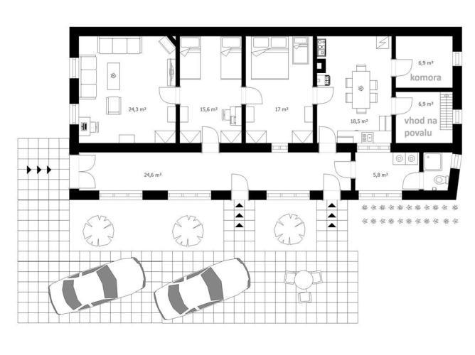 Dispozične pozostáva dom z troch priechodných izieb – obývačky, spálne a detskej izby, ďalej z kuchyne, komory, práčovne, kúpeľne spojenej s WC a priestrannej chodby, ktorá vedie pozdĺž celého domu. Práve táto široká a krásne presvetlená chodba ponúka možnosť jednoduchého vytvorenia samostatných vstupov do jednotlivých miestností, čím sa bývanie stáva ešte komfortnejším.