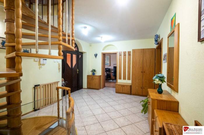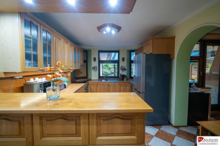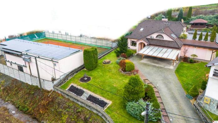 • veľkorysá dispozícia: priestranné izby, elegantné kúpeľne, obývačka s krbom, veľká kuchyňa, terasy, hosťovský domček, posilňovňa a dvojgaráž,
