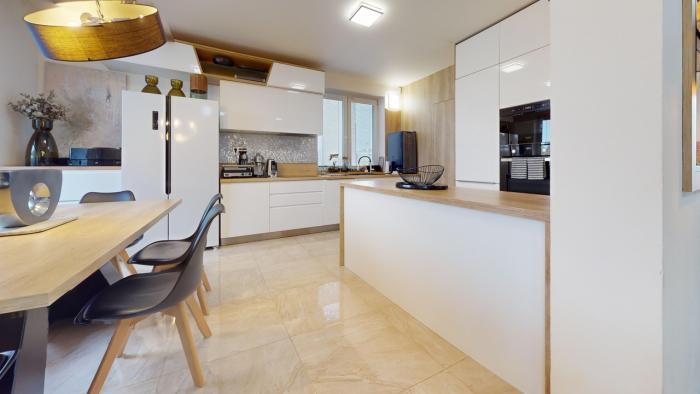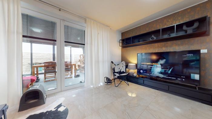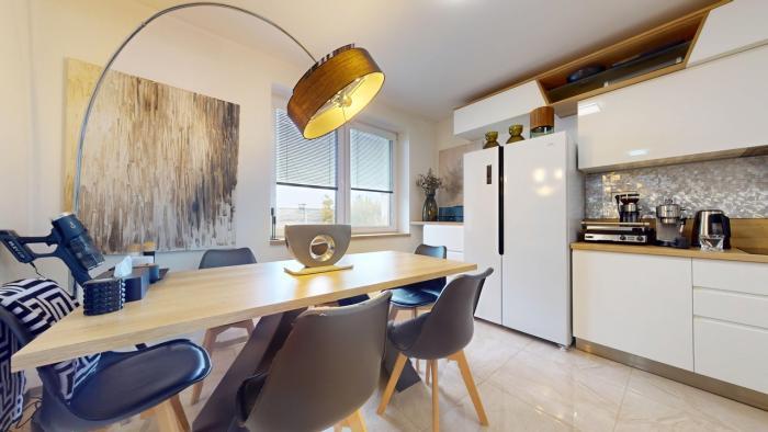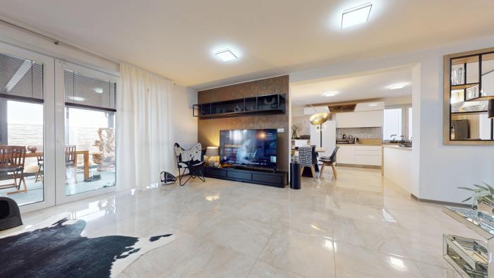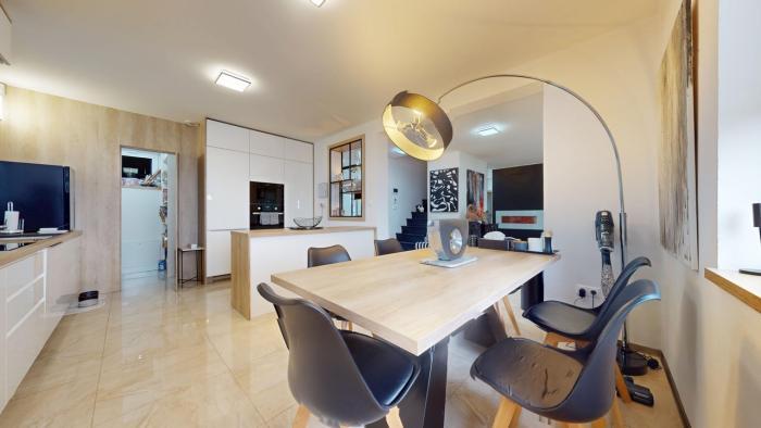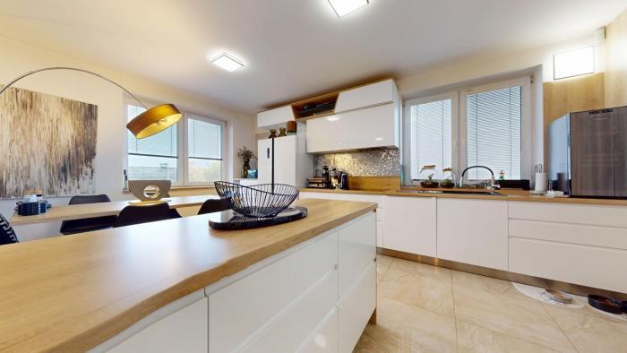 Jedinečnú atmosféru interiéru dopĺňajú keramické podlahy z vysokolešteného gressu na prízemí + originálne parketové podlahy v izbách na poschodí, dizajnové osvetlenie a elektrický krb v obývačke aj na poschodí, komfortná nadčasová kuchynská linka s kuchynským ostrovom, so vstavanými kuch. spotrebičmi najvyššieho radu od renomovaných výrobcov.