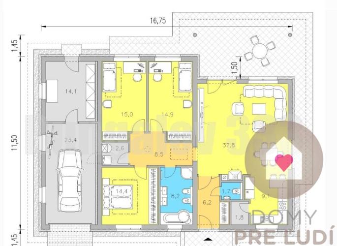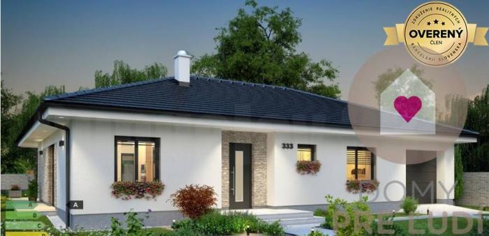 Dispozícia: Vstupná chodba, Technická miestnosť, Obývacia izba spojená s kuchyňou so špajzou, 3 samostatné izby, Kúpeľňa, Samostatné WC, Garáž