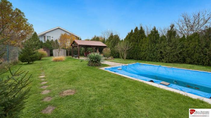 Na pozemku sa nachádzajú 2 úložné priestory, altánok, vonkajší krb, bazén 8x4,6m, hĺbka 1,5m, sprcha, jazierko a krásna parková úprava.