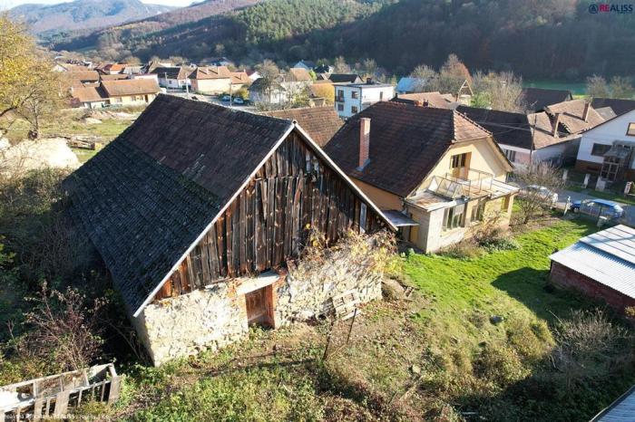 Opis: rodinný dom je čiastočne podpivničený, má jedno obytné podlažie a podkrovie s manzardnou časťou a terasou s výhľadom na pozemok ( terasa je umiestnená na vstupnou chodbou ). Prízemné obytné podlažie ( dostupné z prednej časti, aj z dvora ) je tvorené vstupnou chodbou, ktorá prechádza ku centrálnej chodbe, veľkou kuchyňou, dvomi priestrannými izbami orientovanými na slnečnú juhozápadnú stranu, komorou, kúpeľňou a schodiskom do pivníc. Pivnice pozostávajú zo skladu a kotolne. Rodinný dom bol postavený z pálenej tehly. Má betónové podlahy, v dvoch izbách prekryté drevenou palubovkou a v kúpeľni keramickou dlažbou. Strešnú krytinu tvorí pálená škridla. Stropy sú medzi pivnicami a obytným podlažím z monolitického železobetónu a medzi obytným podlažím a povaľou je drevený trámový strop s podbitím a omietkou. Okná sú pôvodné, drevené - dvojité, v izbách orientovaných na slnečnú juhozápadnú stranu osadené vonkajšími žalúziami. Rodinný dom je pripojený na inžinierske siete - el. energiu 230 V / 400 V a verejný vodovod. Vykurovanie domu je zabezpečené ústredným kúrením radiátorovým, vyhrievaným kotlom na tuhé palivo. Teplá voda je pripravovaná v samostatnom bojleri na tuhé palivo. Toaleta je suchá v exteriéri. Vedľa domu je k dispozícii stavba murovanej garáže pre jeden osobný automobil ( využiteľná aj ako dielňa ), so skladom dreva v jej zadnej časti. Garáž má vstup cez dvojkrídlovú oceľovú bránu. Za rodinným domom, pri rozľahlej záhrade je postavená stavba pomerne veľkej hospodárskej budovy ( postavenej z kameňa ) užívanej ako sklad. Rodinný dom sa nachádza v pôvodnom stave a bude vyžadovať údržbu a renováciu. Celková rozloha na juho-západ orientovaného slnečného pozemku je až 2.131 m2, zastavaná plocha domu je 120 m2 a úžitková 93 m2.