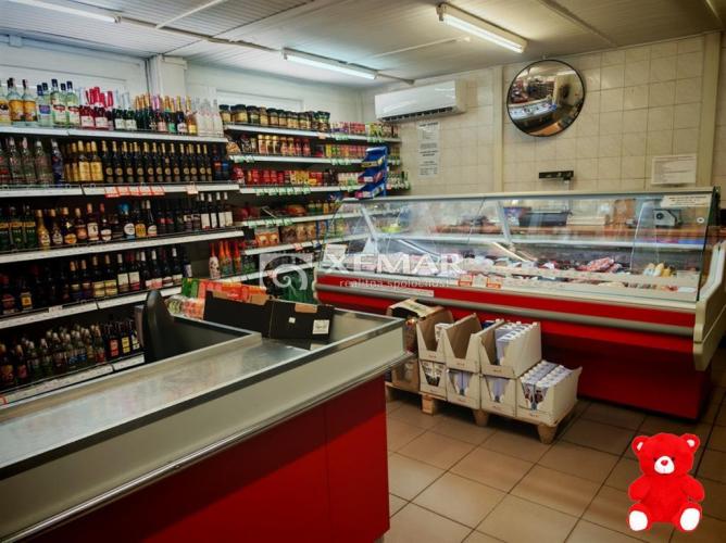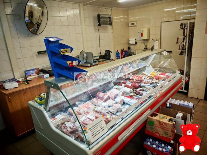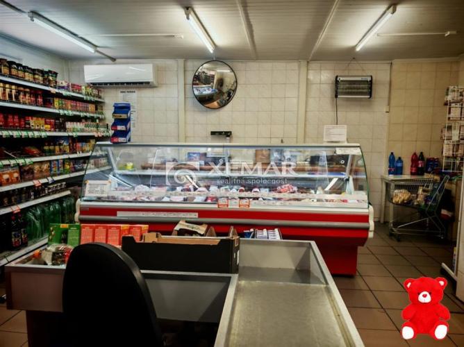 Priestranná predajňa rozdelená na časť s potravinami a časť na predaj mäsa.