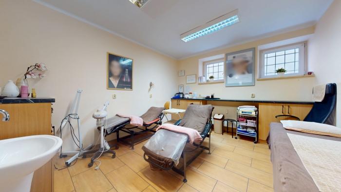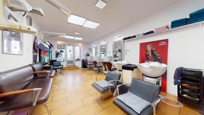 Priestor je dispozične rozdelený na časť prevádzkovanú ako kozmetika s recepčným pultom a umývadlom a kaderníctvo s kreslami, príslušenstvom a umývadlom. Zázemie pozostáva z toalety, miestnosti so šatňou/skrinkami pre zamestnancov, umývadlom, práčkou a sušičkou a malej miestnosti – mini kuchynky s chladničkou, mikrovlnkou a kávovarom.